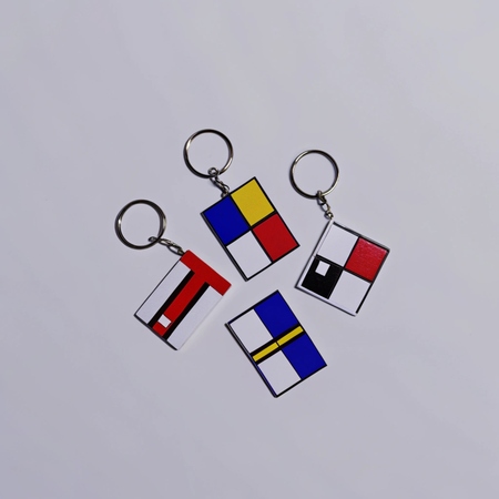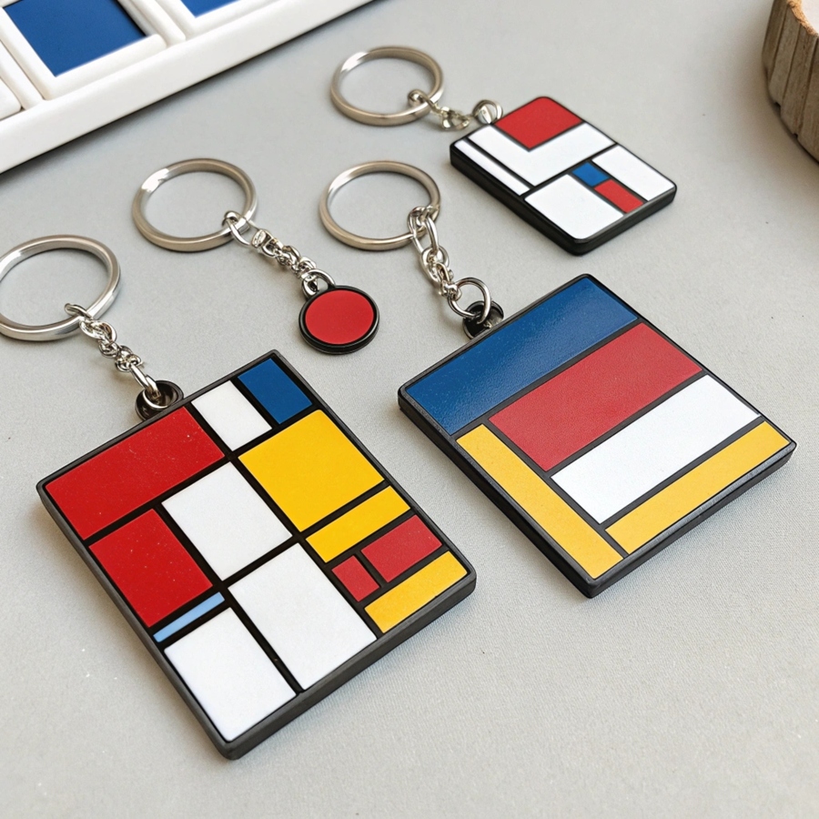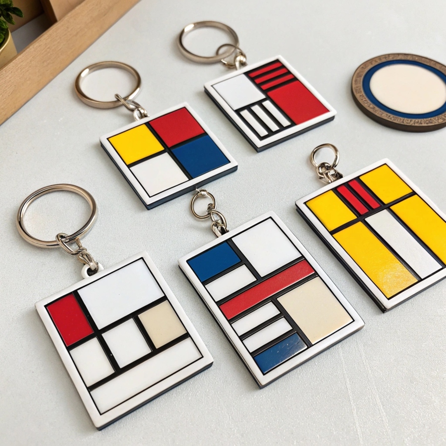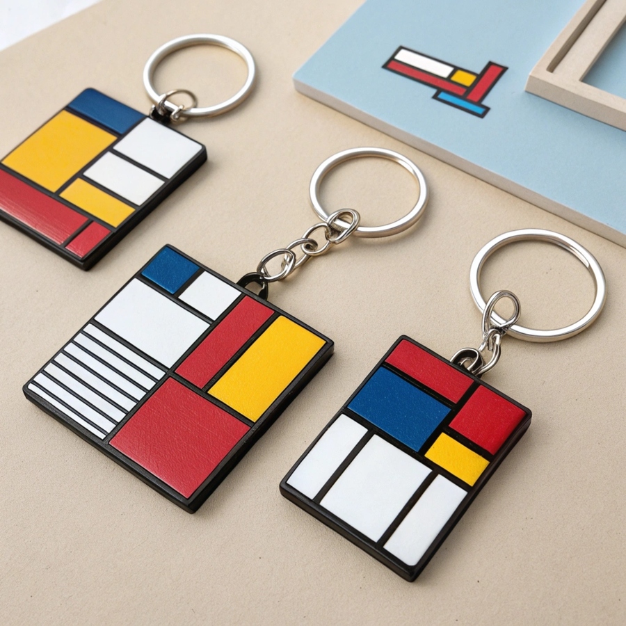 «Create a simple keychains inspired by the De Stijl art movement. The keychains should feature geometric shapes and the classic color palette of red, blue, yellow, black, and white. A focus on the keychains as unique art pieces. Include the De Stijl style in the background, with bold lines and simple shapes, to emphasize the artistic and stylish nature of the keychains.»