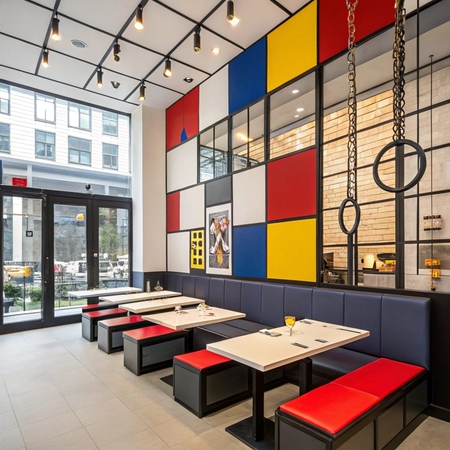 «Create a realistic visualization of a modern restaurant inspired by Theo van Doesburg and the De Stijl movement. The interior features bold geometric shapes, clean lines, and a vibrant color palette of red, blue, yellow, black, and white. The space includes minimalist furniture with rectangular tables, modular seating, and artistic wall panels displaying abstract compositions. On the walls and shelves, showcase a collection of keychains inspired by De Stijl, featuring geometric designs and primary colors. These keychains serve as decorative elements and souvenirs available for purchase. The atmosphere is bright and inviting, with large windows providing natural light and modern lighting fixtures enhancing the colors and details. The overall aesthetic combines artistic sophistication with a welcoming dining experience.»