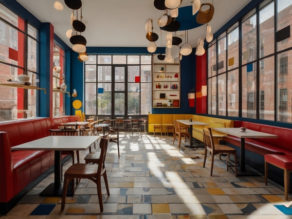 «Create a visualization of a modern café inspired by Theo van Doesburg and the De Stijl movement. The interior should feature a vibrant color palette (red, blue, yellow, black, and white) with a focus on geometric shapes and minimalist design. Include decorative elements such as keychains used for table numbering, hanging on the counter, and displayed on shelves as part of the artistic concept. The space should feel bright, cozy, and modern, with clean lines and a harmonious atmosphere that highlights the café's unique aesthetic.