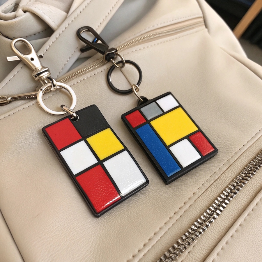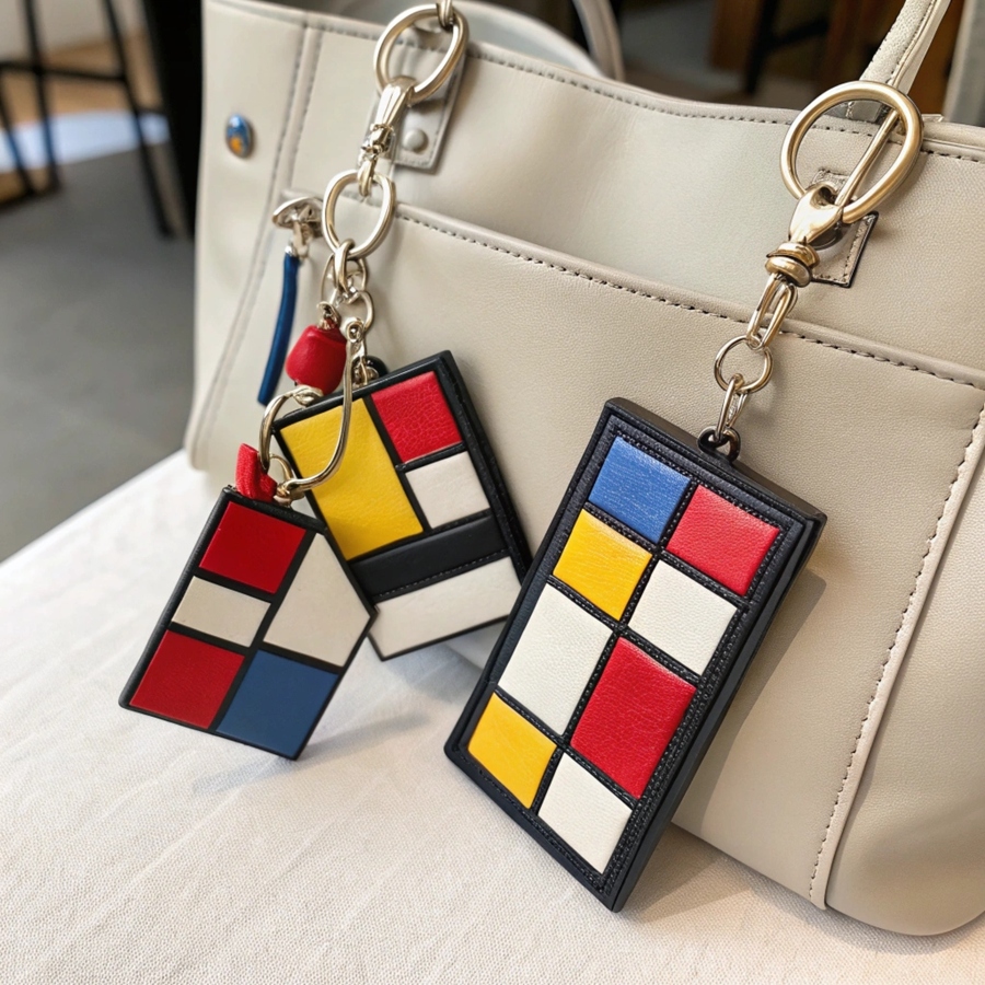 «Generate a realistic visualization of keychains in the style of Theo van Doesburg and the De Stijl movement, attached to fashionable bags. The keychains should feature geometric shapes — rectangles, squares, and lines — with a vibrant color palette of primary colors (red, blue, yellow) alongside black and white. The materials should appear smooth and polished, such as glossy enamel, acrylic, or painted metal. Display the keychains hanging elegantly from the straps, zippers, or handles of minimalist, neutral-colored bags (e.g., black, beige, or gray). Use soft, natural lighting to highlight the textures and details, making the composition clean, modern, and visually striking.»