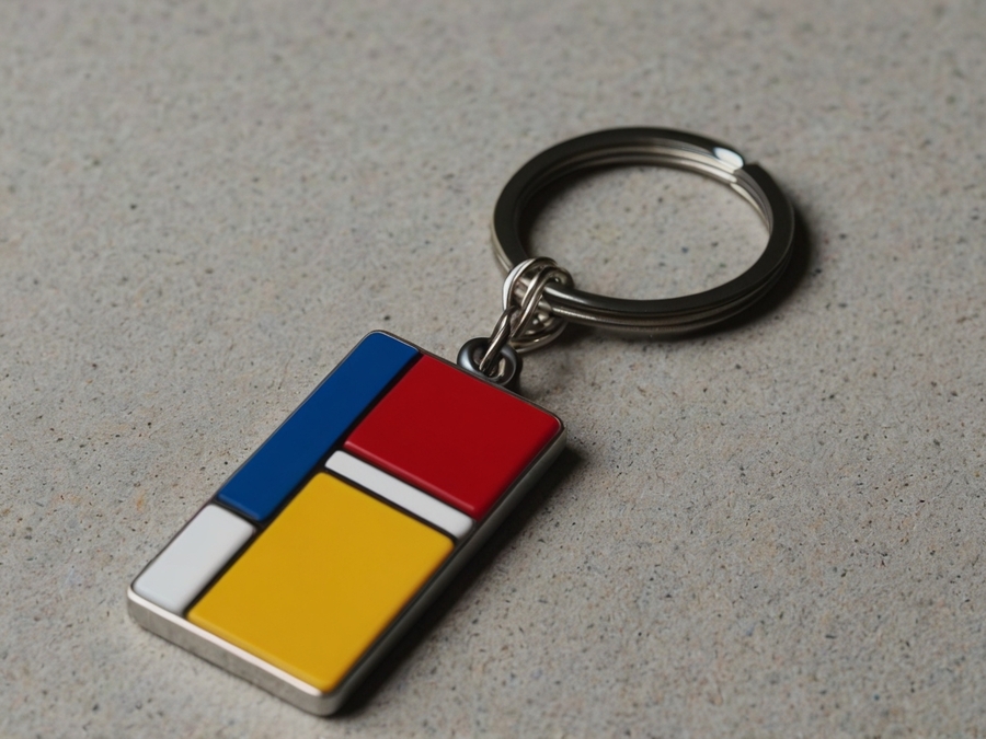 «Create a realistic visualization of a collection of keychains inspired by Theo van Doesburg and the De Stijl movement. Each keychain features geometric shapes (squares, rectangles, and straight lines) and a color palette of primary colors: red, blue, yellow, with black and white accents. The keychains should have a modern, minimalist design made of enamel-coated metal, acrylic, or painted wood. Display them on different surfaces — attached to keys, hanging on bags, or presented in a flat lay style. Ensure the lighting is soft and highlights the smooth textures, glossy finishes, and vibrant colors. The overall composition should look artistic, clean, and appealing for a modern audience.»