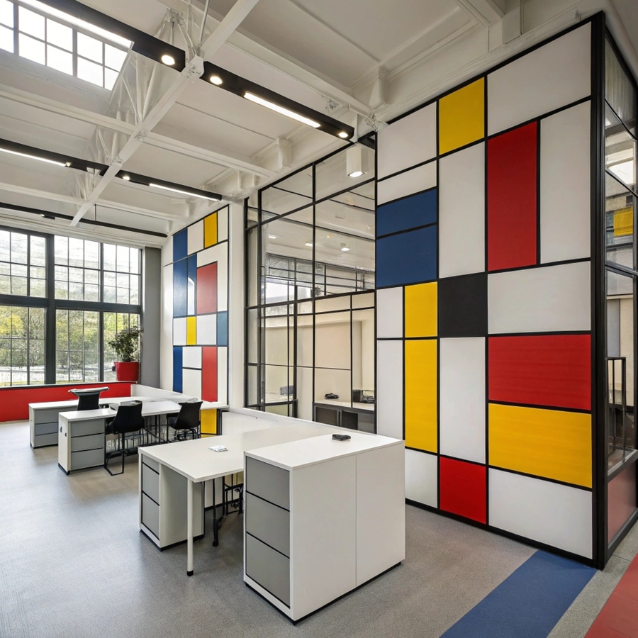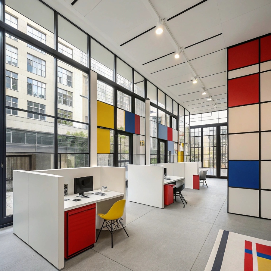 «Create a realistic visualization of a modern office inspired by Theo van Doesburg and the De Stijl movement. The space should feature geometric shapes, clean lines, and a color palette of primary colors: red, blue, yellow, black, and white. Include minimalist furniture with rectangular desks, modular shelves, and chairs featuring sharp geometric contours. Decorate the walls with panels and abstract compositions of intersecting lines and colored blocks. Incorporate large windows for natural light and modern, sleek lighting fixtures. The space should feel functional, clean, and artistic, combining work zones, meeting rooms, and small relaxation areas in the De Stijl style.»