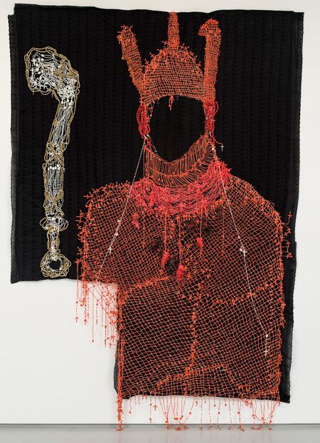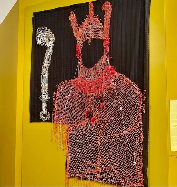 «Я — Огисо, Царь Небесный», Виктор Эхяхаменор, 2017. Чётки на кружевном текстиле / «Я — Огисо, Царь Небесный» на выставке «Бенин. История ограбления», Гамбург, Германия, 2021 г.