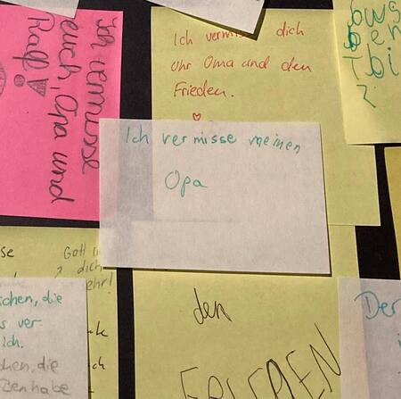 Записки посетителей выставки I MISS YOU, Музей Раутенштрауха-Йоста, Кельн, Германия, 2023 г. / записка «я скучаю по тебе, дедушка»