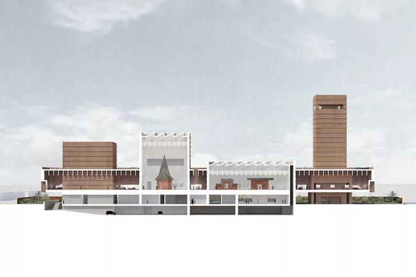 План 1-го этажа музея MOWAA c руинами Бенина / разрез музея MOWAA, Adjaye Associates, 2023 г.
