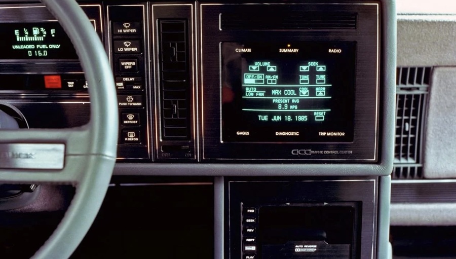 Первым серийным автомобилем с технологией сенсорного экрана стал Buick Riviera 1986 года выпуска. Важно отметить что дизайн центральной консоли и приборной панели напоминает типичный телевизор тех годов, а цвет интерфейса такой же как и у DVD приставок тех лет. Прямое заимствование технологий.