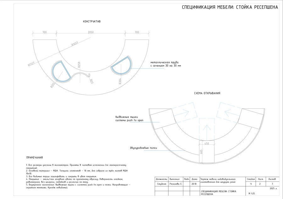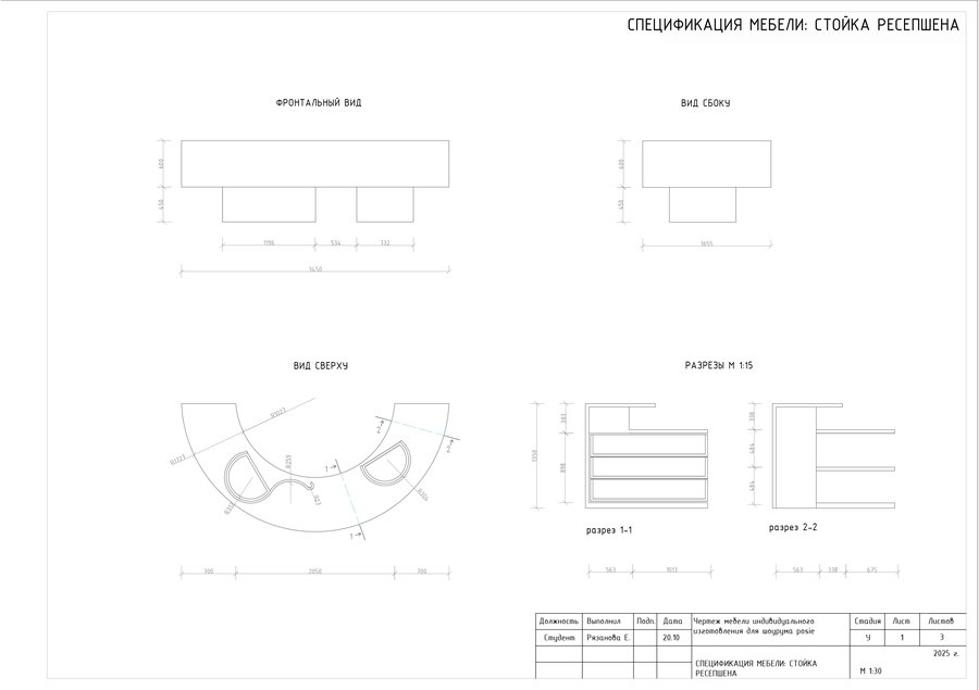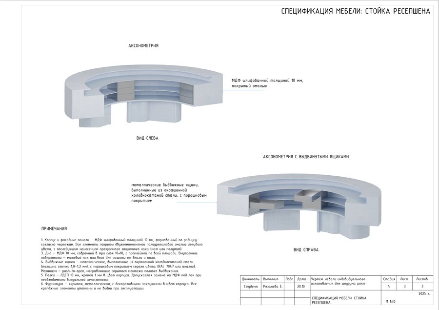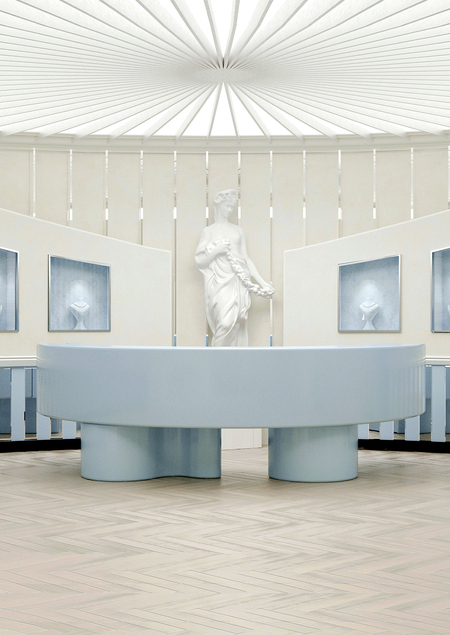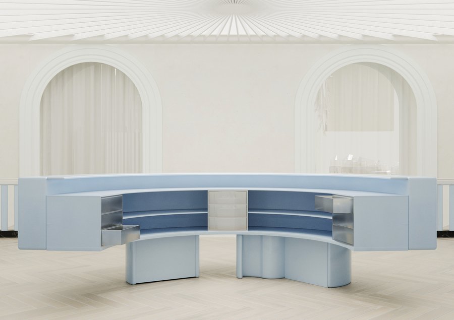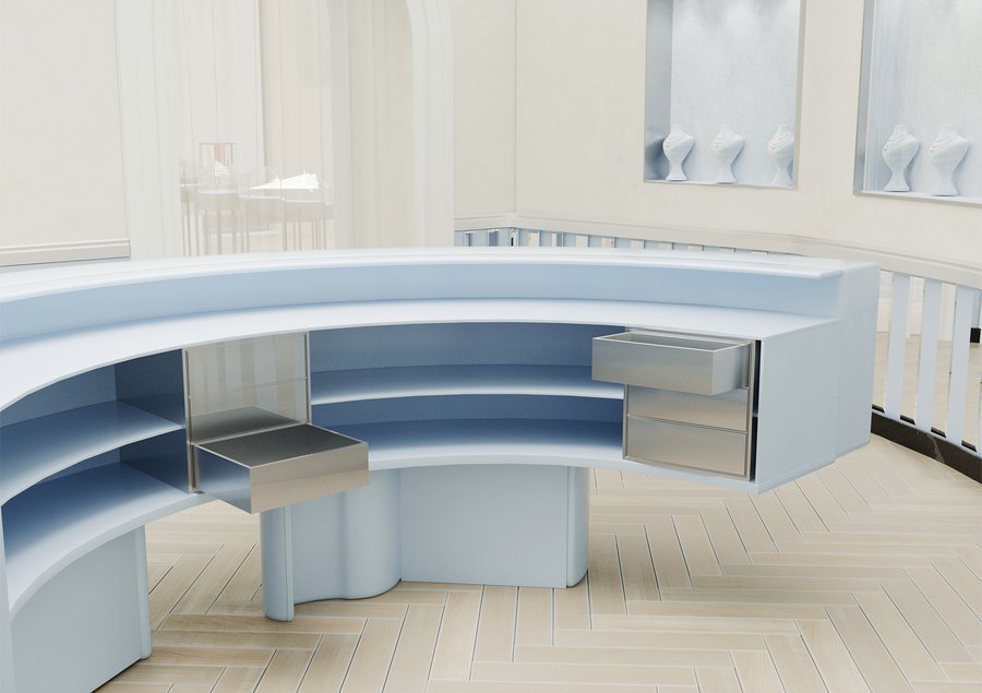 Радиальная стойка ресепшена для шоурума ювелирного бренда «POSIE» выполнена из МДФ, покрытого голубой эмалью. Мягкие линии и зеркальный блеск создают ощущение лёгкости и утончённого сияния, отражая эстетику украшений бренда.