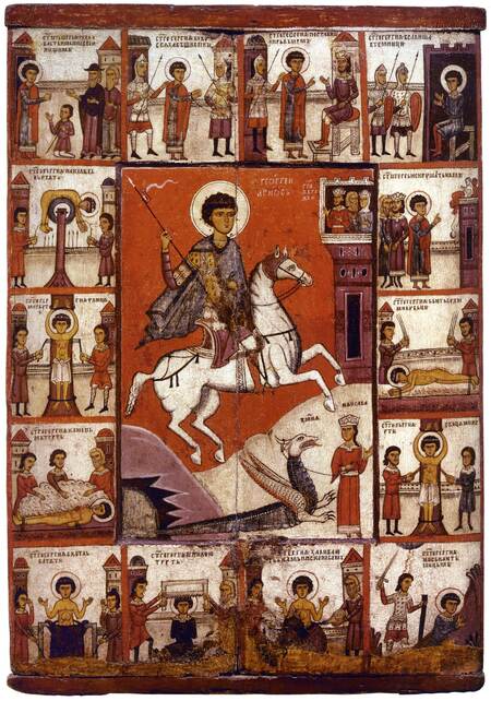 1. Георгий с житием. Новгород. начало XIV века 2. Святой Пантелеймон с житием. начало XIII века