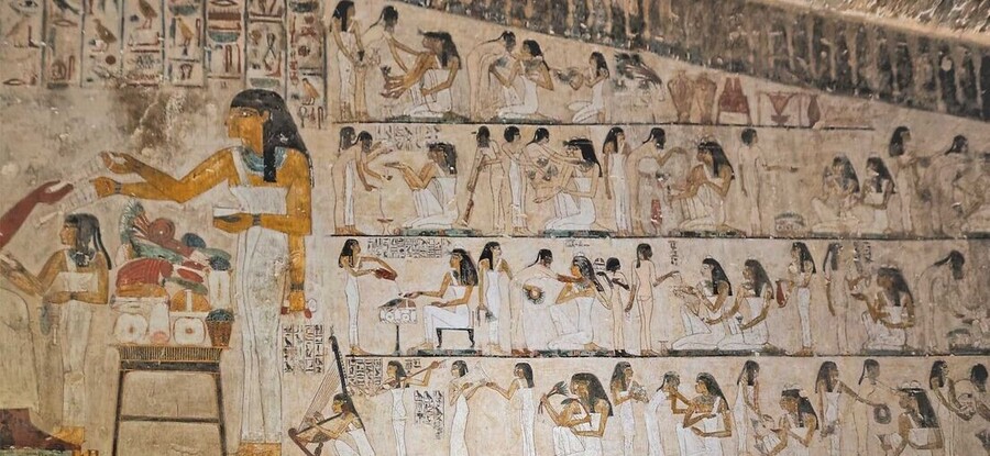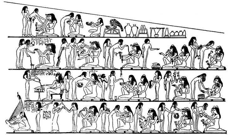Обратимся в изображению пира в росписи гробницы Рехмира в Фивах. На фреске видно, как египтяне изображали процессуальность — события пира изображаются единым полотном, которое имеет горизонтальную структуру. Логически такой ряд читается как таймлайн, но на деле им не является: события не составляют хронологии, но показывают, что пир — это длительность, ряд событий.