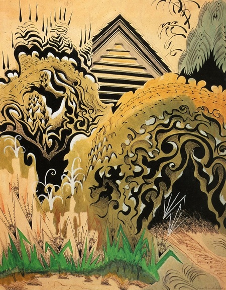 На работе «Хор насекомых» Чарльза Берчфилда повторяющиеся кривые линии, зигзаги буквально гудят создавая впечатление жаркого летнего дня, наполненного звуками цикад стрекотания цикад. Также ощущение жары передается за счет ритма волнистых линий над крышей.