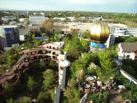 Еще один дом архитектора — «Лесная спираль» в Дармштадте. Плавные линии стен напоминают холмы, гармонично сливаясь с окружающей средой. Крыша здания доступна для прогулок: на ней высажены деревья, цветы, кустарники и даже обустроен небольшой пруд.