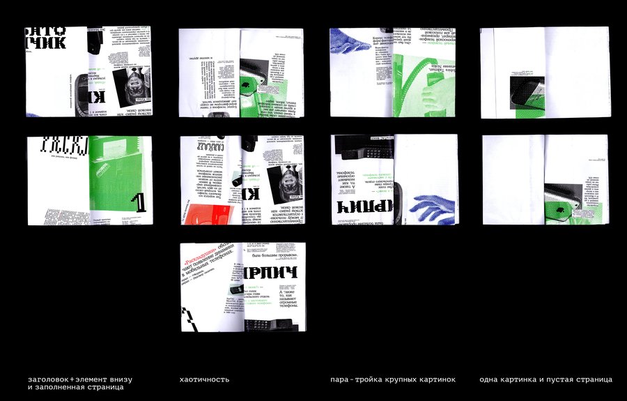 Плакаты сложились в случайную тетрадь. Анализ композиций получившихся страниц помог выявить ряд приемов, которые стали использоваться в зине для конкретных типов разворотов.