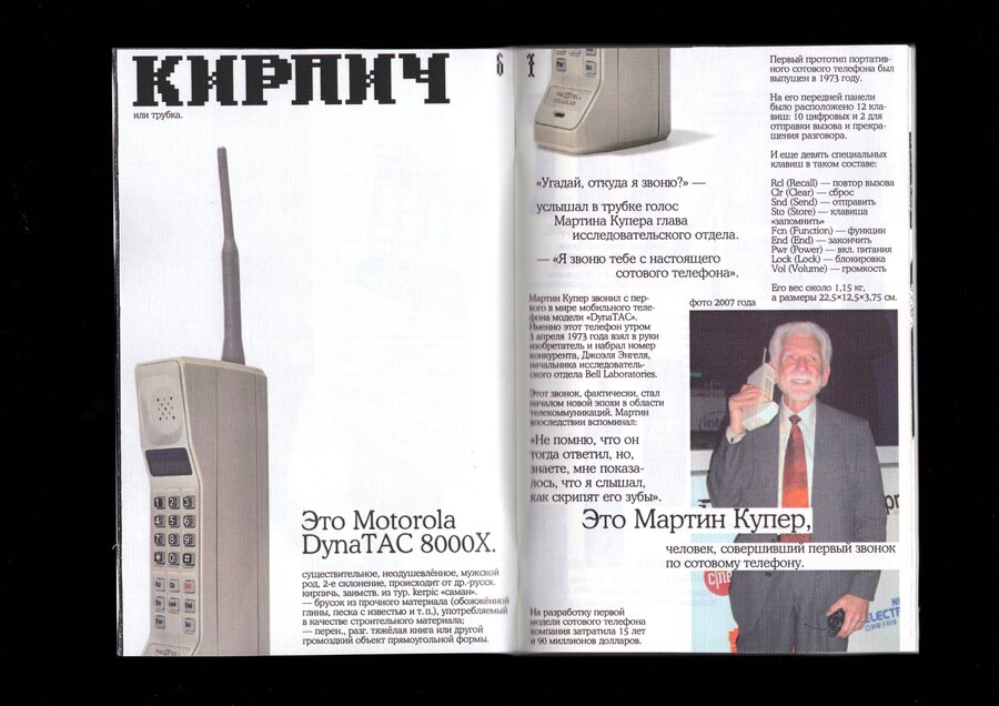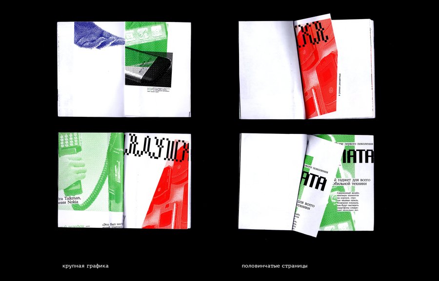 В зине использовались такие решения, как возможность показа только половины кнопочных телефонов благодаря их симметричности, а также появление наклонных текстов в главе о динамичных телефонах.