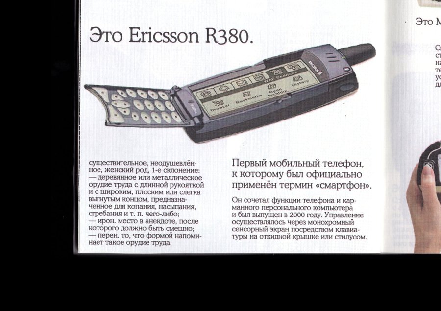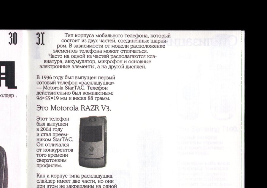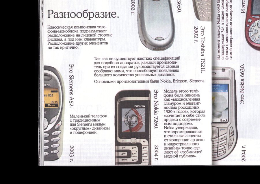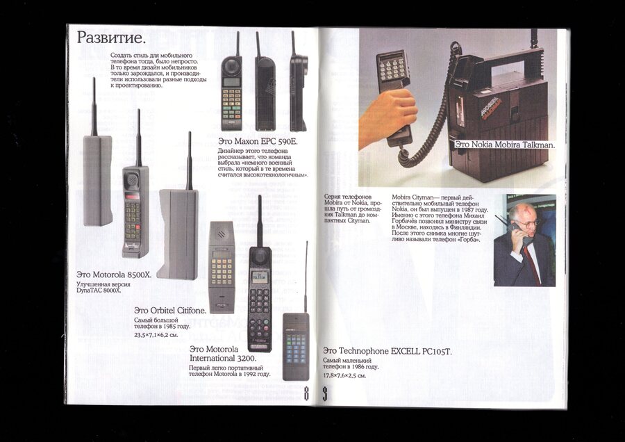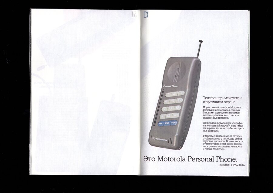 Крупная графика и половинчатые страницы объединились на шмуцтитулах. На вторых расположена историческая справка о событиях, происходящих в момент выпуска телефонов из последующей главы, для более полного понимания контекста времени и уровня развития технологий.