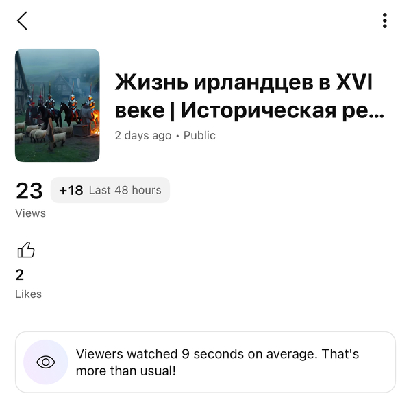 За 48 часов ролик набрал 23 просмотра и 18 новых просмотров за последние 2 дня. Это крайне низкий показатель для Shorts, которые обычно получают тысячи просмотров в первые часы, если алгоритм их продвигает. Среднее время просмотра — 9 секунд, что, по мнению YouTube, «больше, чем обычно». Однако для Shorts (которые длятся до 60 секунд) этого недостаточно. Зрители не досматривают ролик до конца, что сигнализирует алгоритму о низкой вовлечённости. Всего 2 лайка при 23 просмотрах — это конверсия ~8.7%, что неплохо, но из-за малого количества просмотров статистика нерепрезентативна.