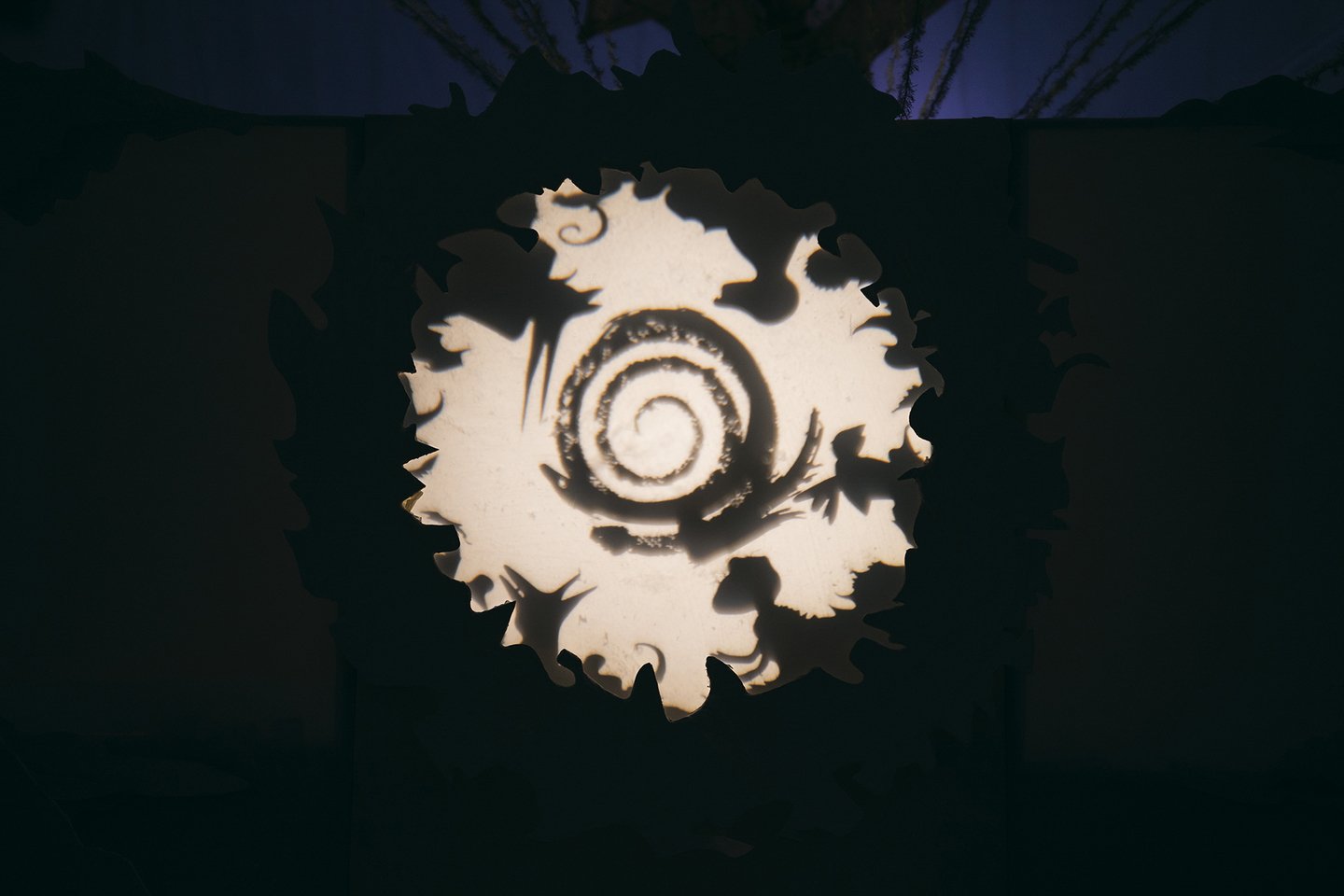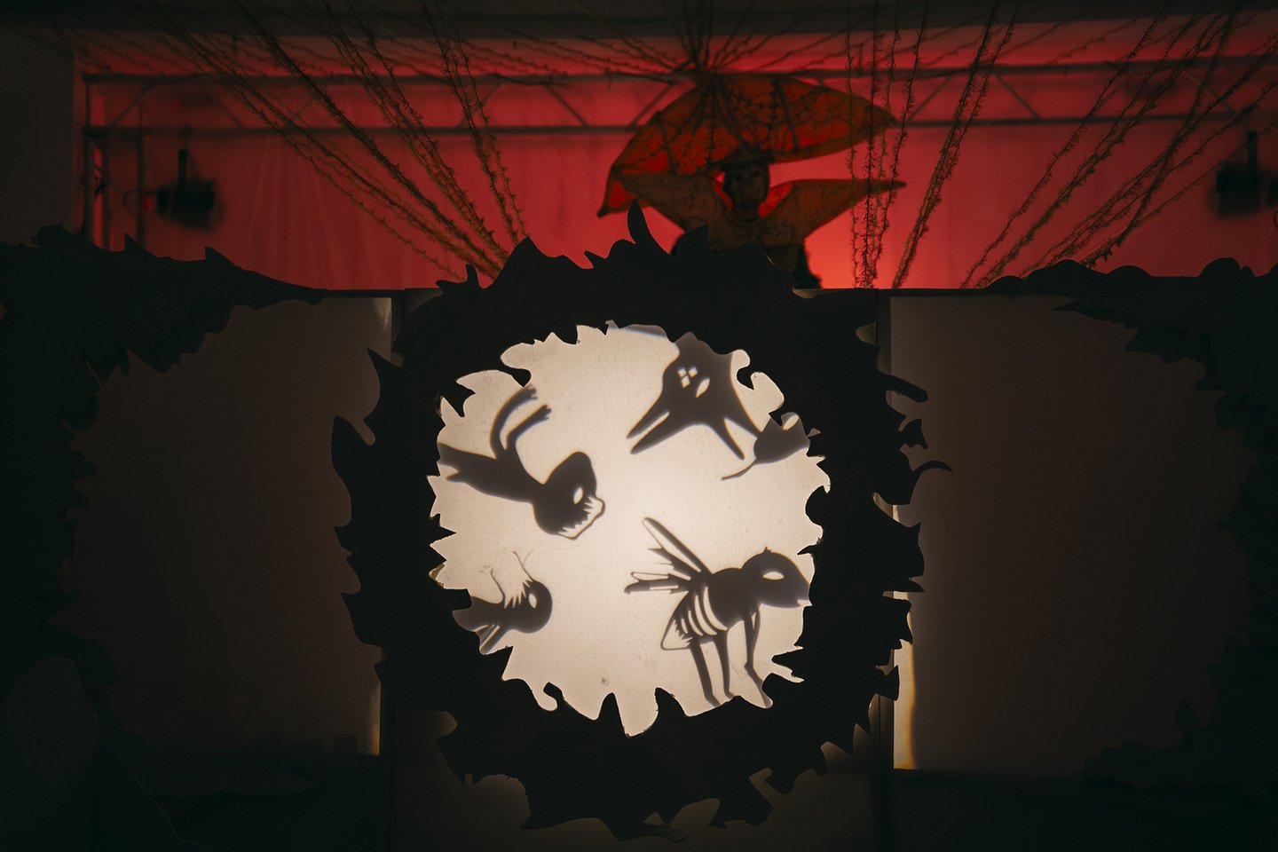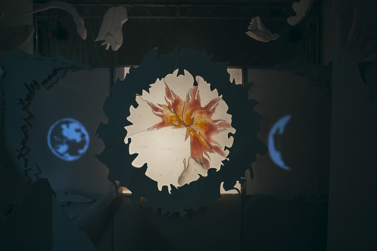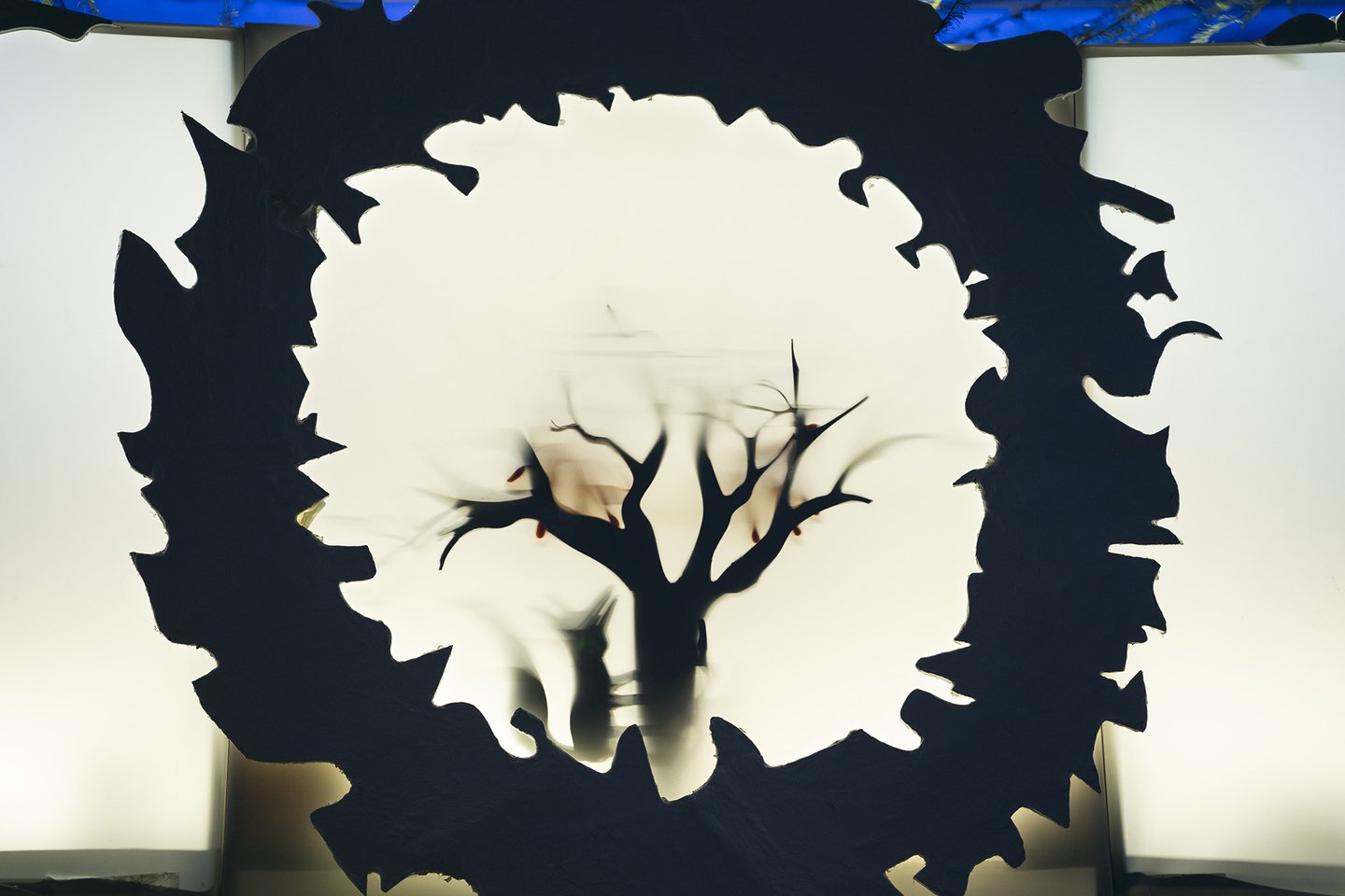 В теневом спектакле основным элементом внешних декораций является центральный экран. Он выступает в роли важного символа цикличности природы. Круг становится центром, вокруг которого разворачивается действие, позволяя зрителям сосредоточиться на взаимодействии персонажей и их взаимосвязях, тем самым формируя целостное восприятие истории.