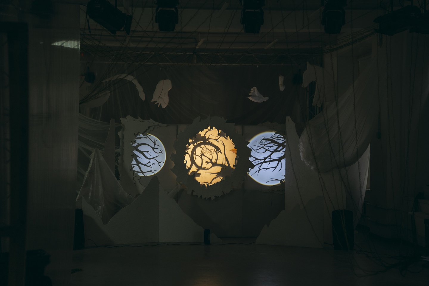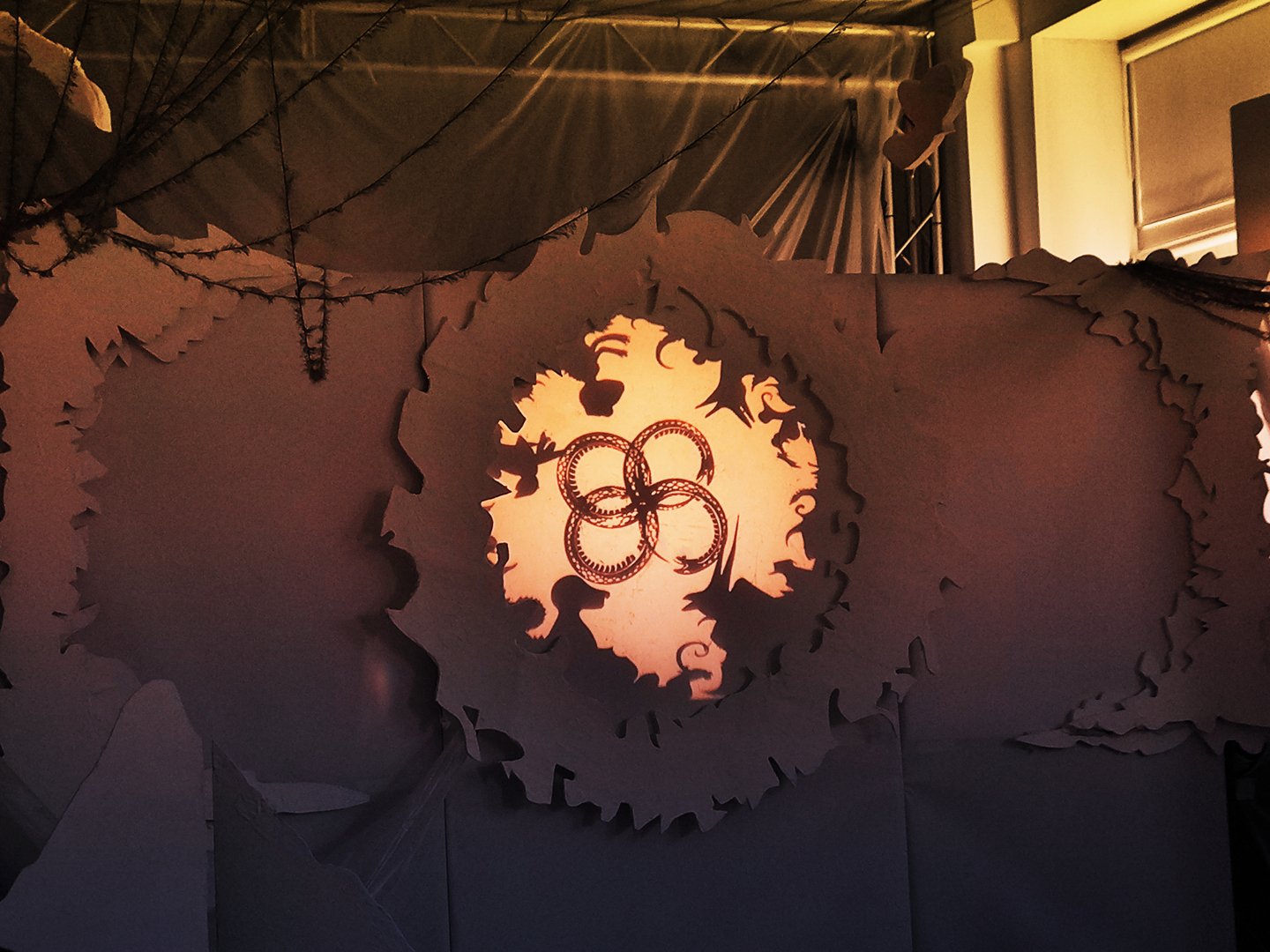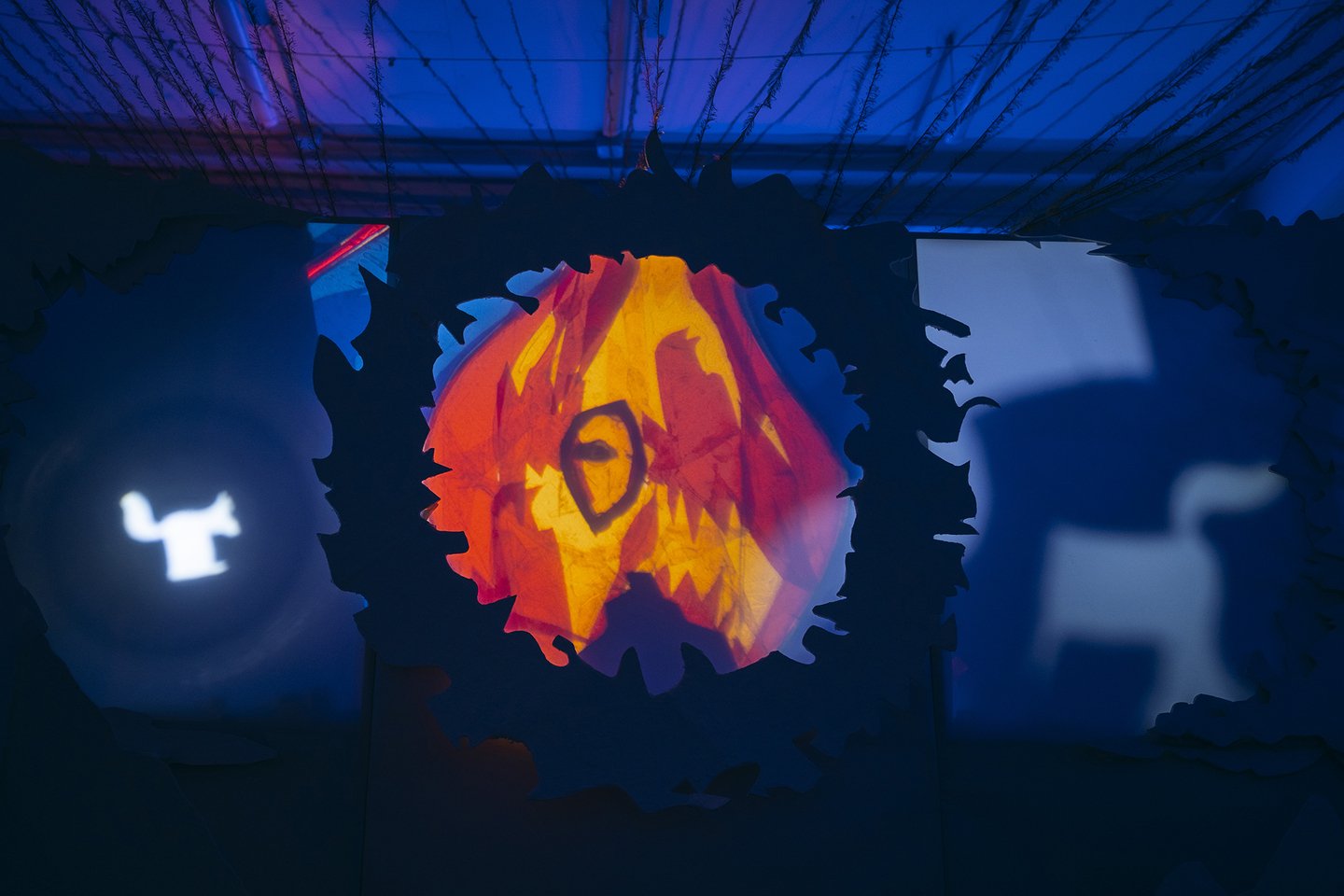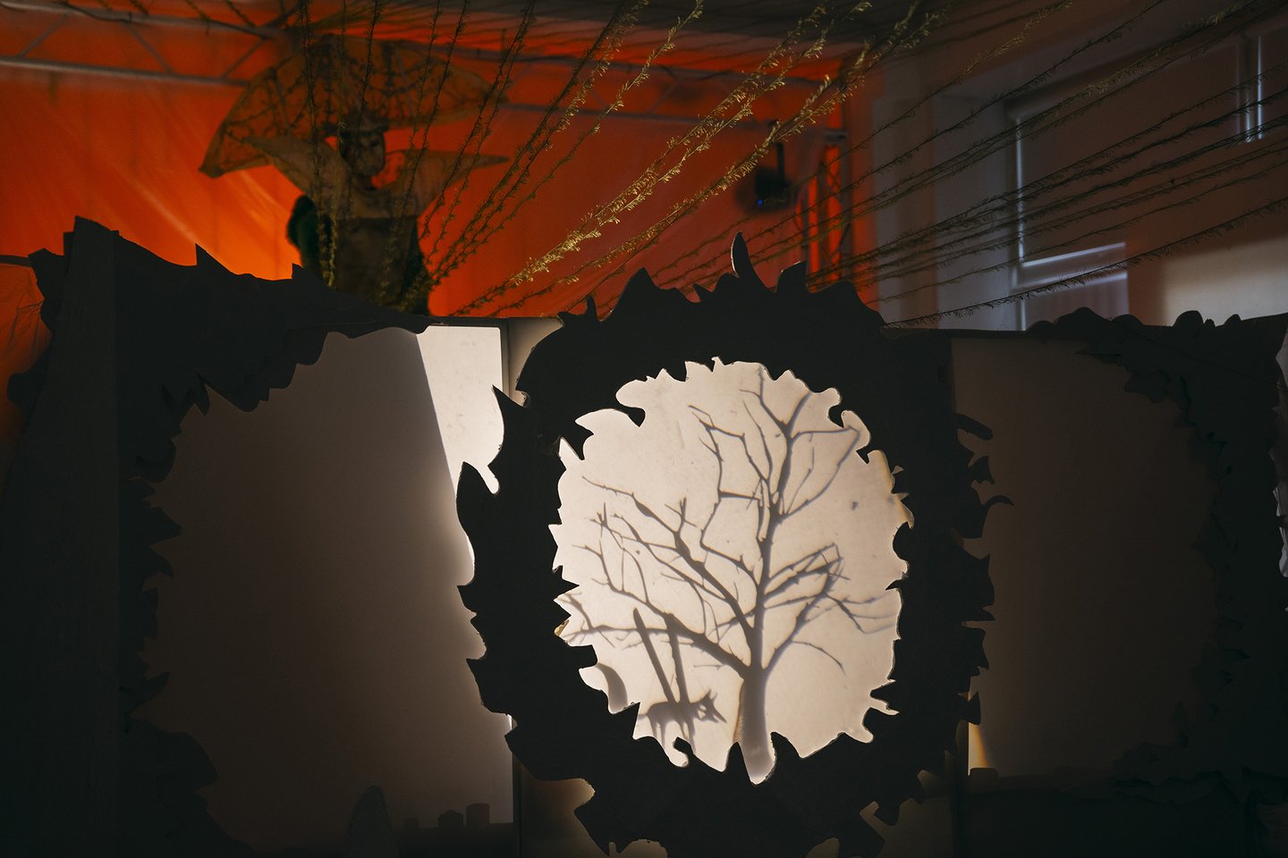 В теневом спектакле основным элементом внешних декораций является центральный экран. Он выступает в роли важного символа цикличности природы. Круг становится центром, вокруг которого разворачивается действие, позволяя зрителям сосредоточиться на взаимодействии персонажей и их взаимосвязях, тем самым формируя целостное восприятие истории.