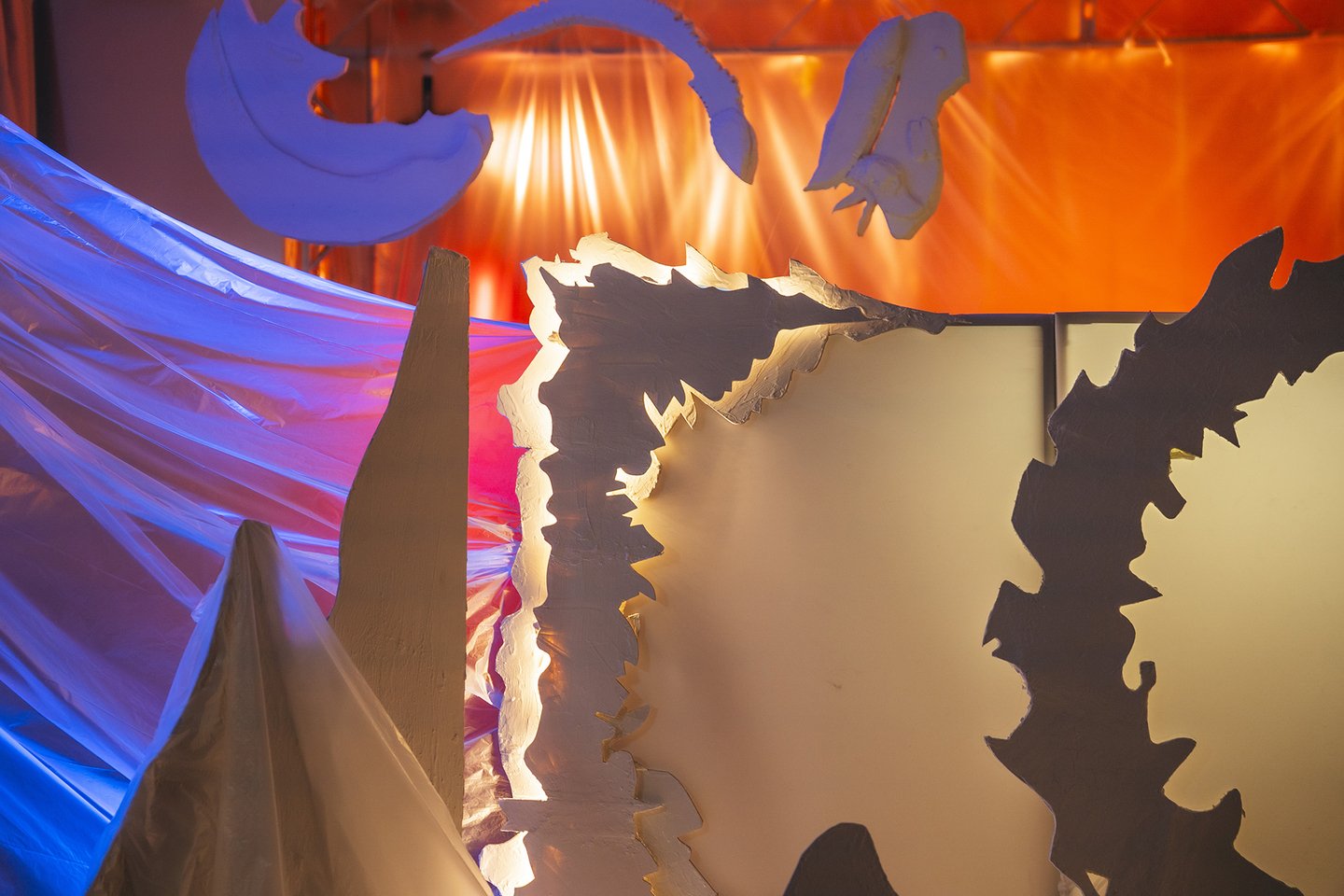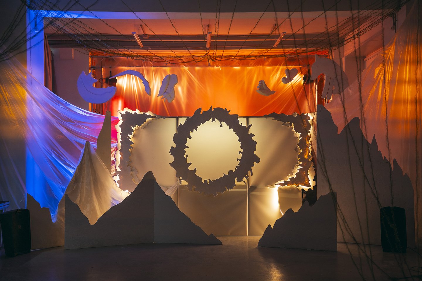 Силуэт гор перед сценой добавляет еще одно измерение — это усиливает ощущение масштабности, позволяя зрителям воспринимать пространство как нечто большее, чем просто сцена. Горные пики создают эффект «вида сверху на мир», через который можно ощутить величие Сада — как божества, олицетворяющего природу, жизнь и гармонию.