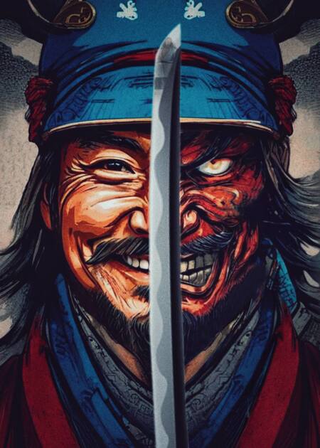 с помощью ии тут были за примерно 25 промтов созданы наконец два нужных мне самурая, потом в Ps их объединяла в одного, добавляла катану, одинаковую одежду и так далее, ну и для полнейшего сюра — элементы картины, о которой идет речь, добавила на катану, тайная вечеря специально в другой стилистике потому что я захотела ее выделить — она будто небрежно намалевана маслом здесь, потом плюс миллион фильтров снепсид, ещё пару фильтров в фш — и постер готов