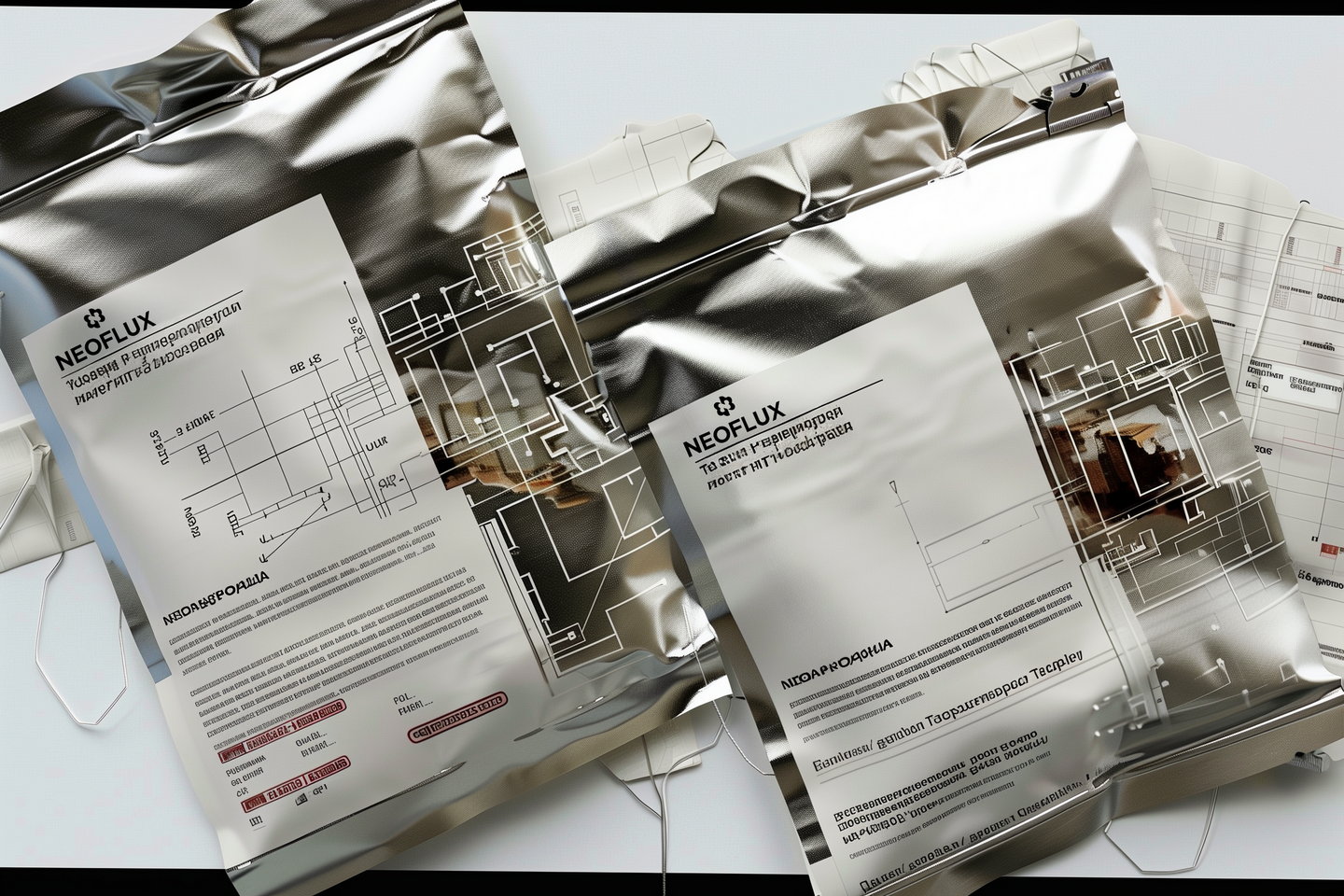 {futuristic sterile packaging design for NEOFLUX implants. Matte metallic foil pouches with embossed text and technical typography. Printed labels include version numbers, implant configurations, and schematic data fields. Design minimal, high-contrast. Soft reflections on the metallic surface, clean background, precise lighting. Mood: scientific, medical, high-tech. --ar 3:2 --style raw --sref https://s.mj.run/USCbh9LYaqc https://s.mj.run/A9xDNgzL2-Y} *Midjourney