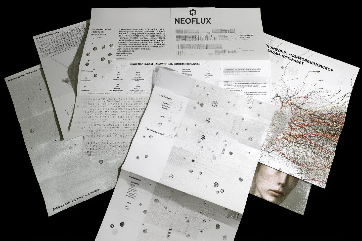 {printed research materials for NEOFLUX project. Set of scientific A4 sheets with grids, coordinates, data dots, embossed code fragments and micro-typography in English. Minimalist neuro-aesthetic layout with memory restoration theme. Metallic and tactile paper textures, experimental sans-serif fonts, dotted connection diagrams, data marks and subtle emboss. Arranged overlapping on black background, studio lighting, sharp focus, high fidelity print design. --ar 3:2 --style raw --sref https://s.mj.run/USCbh9LYaqc https://s.mj.run/A9xDNgzL2-Y} *Midjourney
