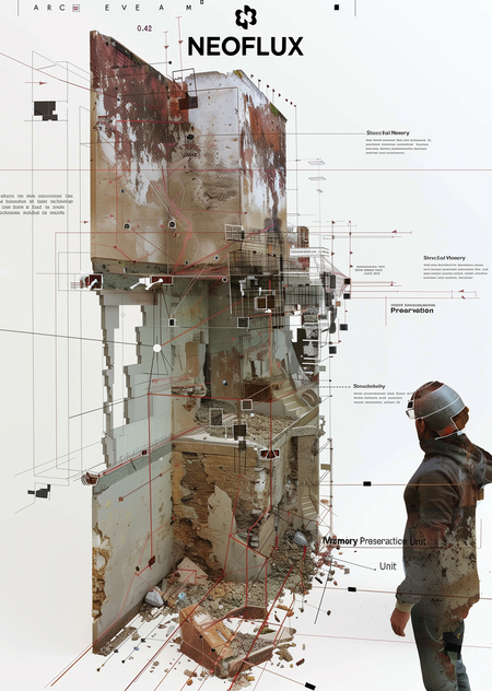 2 плакат: {futuristic scientific poster for NEOFLUX, showing a 3D photogrammetry scan of an old decaying building with visible coordinate lines, height markers, and a human figure for scale. Style: documentary but digital, semi-glitched textures, white background with technical labels --ar 3:2 --style raw --v 6 --sref https://s.mj.run/USCbh9LYaqc https://s.mj.run/A9xDNgzL2-Y} *Midjourney