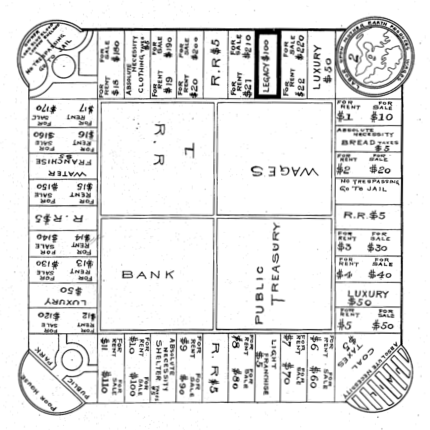 Первый чертеж «Монополии» был запатентован в 1903 году Элизабет Мэги. Она родилась в семье известного издателя газет и увлекалась политикой и журналистикой с детства. Игра, которую она создала должна была отражать ее политические убеждения. Поэтому она представляет собой радикальный контраст с тем, что сегодня ассоциируется с «Монополией». Это был не дизайн игры в современном понимании, а скорее функциональная схема, визуальная лекция. Игровое поле представляло собой простой квадрат с замкнутым маршрутом, лишенным каких-либо декоративных элементов. По сути это был чертеж, где на первый план выходила чистая структура и информация. Каждая клетка была подписана названиями, прямо отражающими её время.