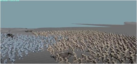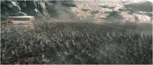 Сражающихся солдат частично представляли загримированные актеры, стоящие в первых рядах, а остальных заменяли цифровые юниты.