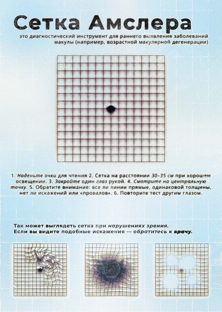 При нормальном зрении линии кажутся прямыми и равномерными, но при патологиях (например, возрастной макулярной дегенерации или отёке сетчатки) они могут казаться искажёнными, разорванными или вовсе пропадать. Чтобы провести тест, держите сетку на расстоянии около 30 см, закройте один глаз и смотрите строго на центральную точку.