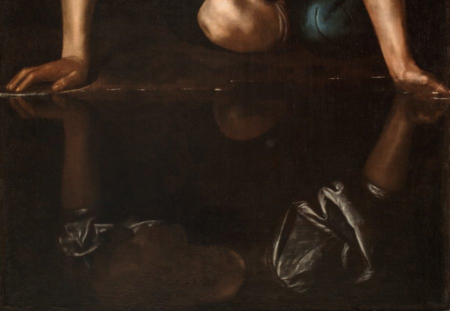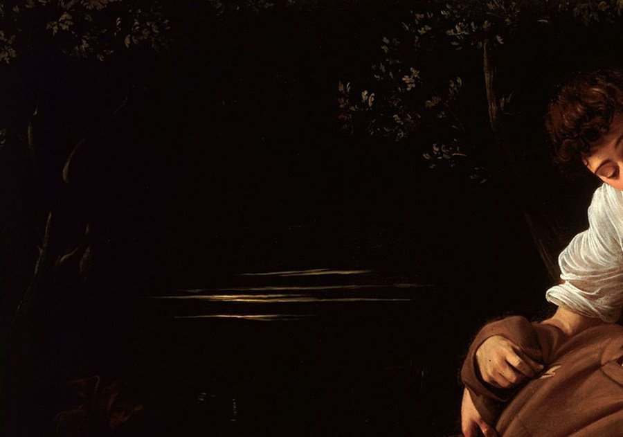 Основой композиции служат главные герои, на которых падает луч света с левого верхнего угла. Кроме того, Микеланджело да Караваджо добавляет освещенные бликами детали, на которые зрителю стоит обратить внимание. Например, на полотне «Экстаз святого Франциска» художник прописывает на заднем плане листву деревьев и яркие, резкие блики на воде, а в картине «Нарцисс» среди всепоглощающей тьмы мы замечаем отражение героя в воде, которое играет важную роль в понимании сюжета.