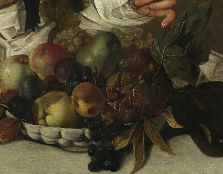 На переднем плане можно увидеть груши с царапинами, которые придают им «жизненности». Слегка изогнутые листы бумаги, ваза, которая поражает своей утонченностью, «живые» складки одежды, а также волосы юноши, которые лишь слегка блестят на свету.