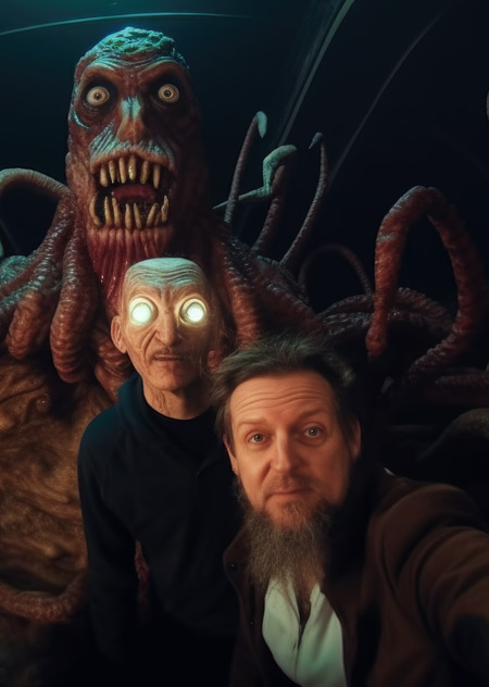 Проект тематизирует гибридную витальность и симбиотическую агентность человеческого и не-человеческого в концептуализациях, разрабатываемых современными спекулятивными философами (Беном Вудардом, Тимоти Мортоном, Юджином Такером, Диланом Триггом, Грэмом Харманом и другими) и фундирующих постгуманистическую перспективу накануне технологической сингулярности. Преодоление субъектно-объектного корреляционизма дано в иронической форме через имитацию принципиально антропоцентрического жанра селфи. Все изображения получены при помощи MidJourney V5.