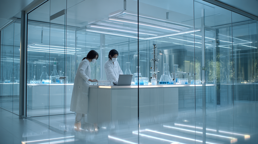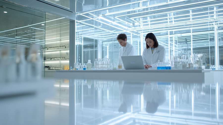 ultra-modern glass-walled cosmetic laboratory, two scientists in white lab coats working with laptop and test tubes, stainless steel counters, blue reagents, LED strip lighting, reflections on glass, minimal clean design, shallow depth of field, high realism, photo shot on 35 mm, cinematic composition, soft HDRI light, subtle fog, premium brand look