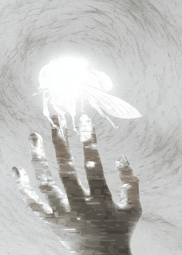 1. humanoid standing, medium shot, bees flying around, soft cold light, blue and white tones predominate, bees have metal wings 2.futuristic bee with aluminum wings, wings twisted in a spiral, Twirl/Polar Vortex effect, Cyber-Y2K image style, noise throughout the image 3.Futuristic bee in the center, with aluminum wings, Twirl/Polar Vortex effect, Cyber-Y2K image style