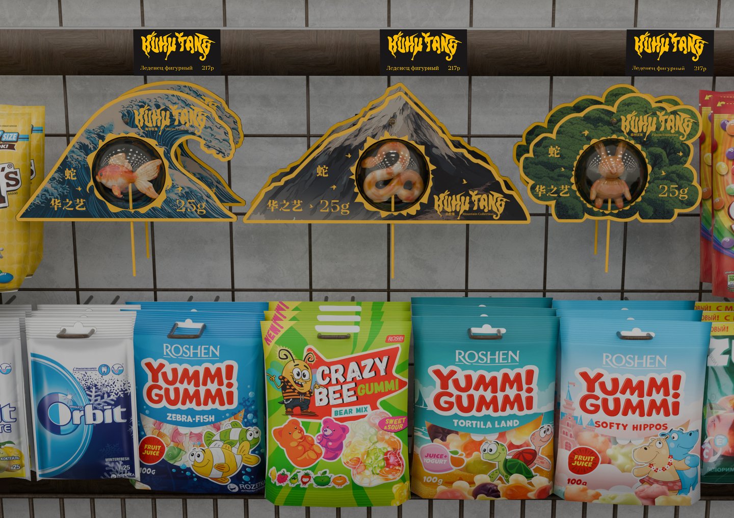 Проект посвящён разработке упаковки для карамельных леденцов в форме животных, выполненных в стилистике китайского ремесла Танхуа (кит. 糖画). Серия состоит из трёх коллекций, каждая из которых отражает среду обитания персонажей: лес, горы и воду. Леденцы создаются мастером и продаются в готовом виде на палочке. Основной акцент сделан на форме упаковки и визуальной системе.
