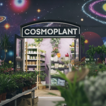 promt: make the interior of a garden store with a starry, space theme. for a garden supplies and seeds store called «CosmoPlant». Нейросеть: ideogram.ai