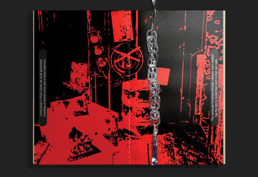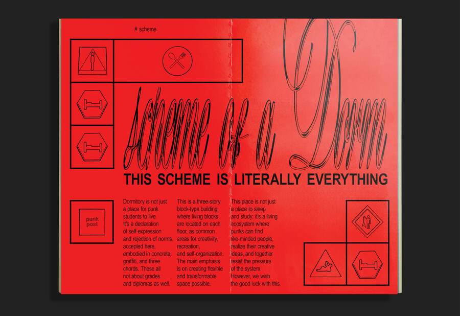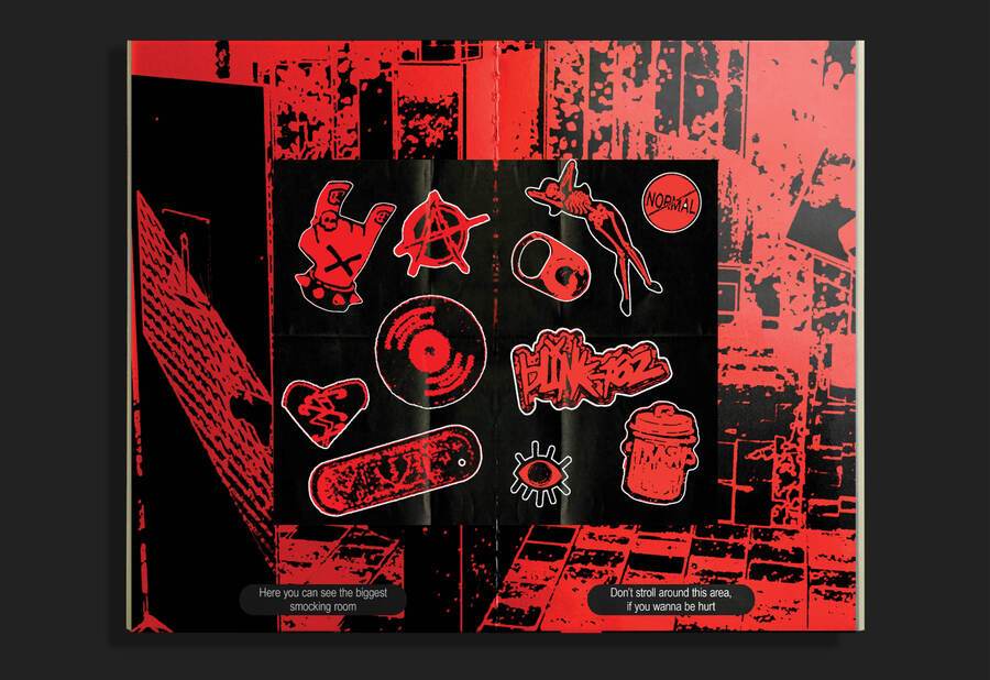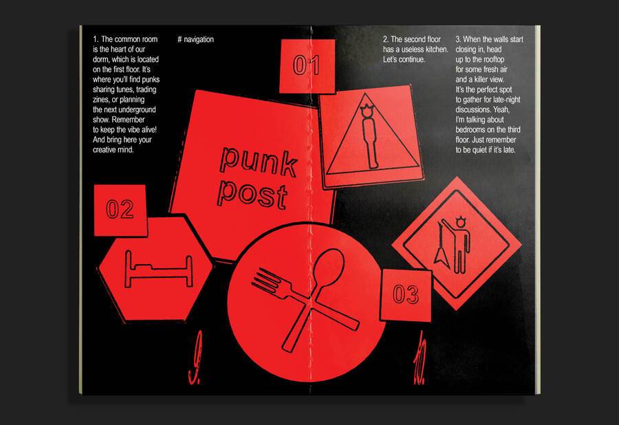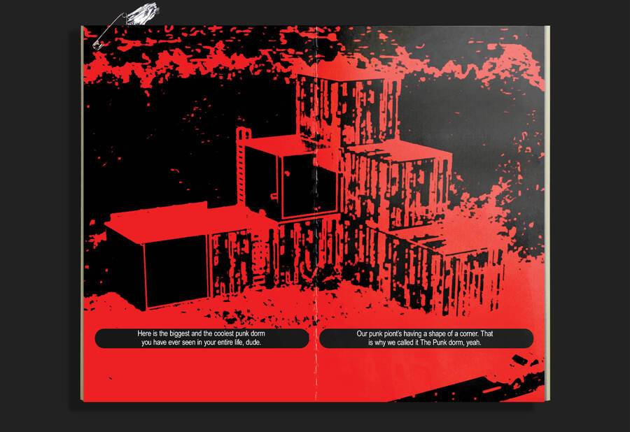 Зин представляет собой инструкцию по выживанию в общаге для панков. Её жильцы обладают бунтарским духом, поэтому принцип типографики — нарушение правил.