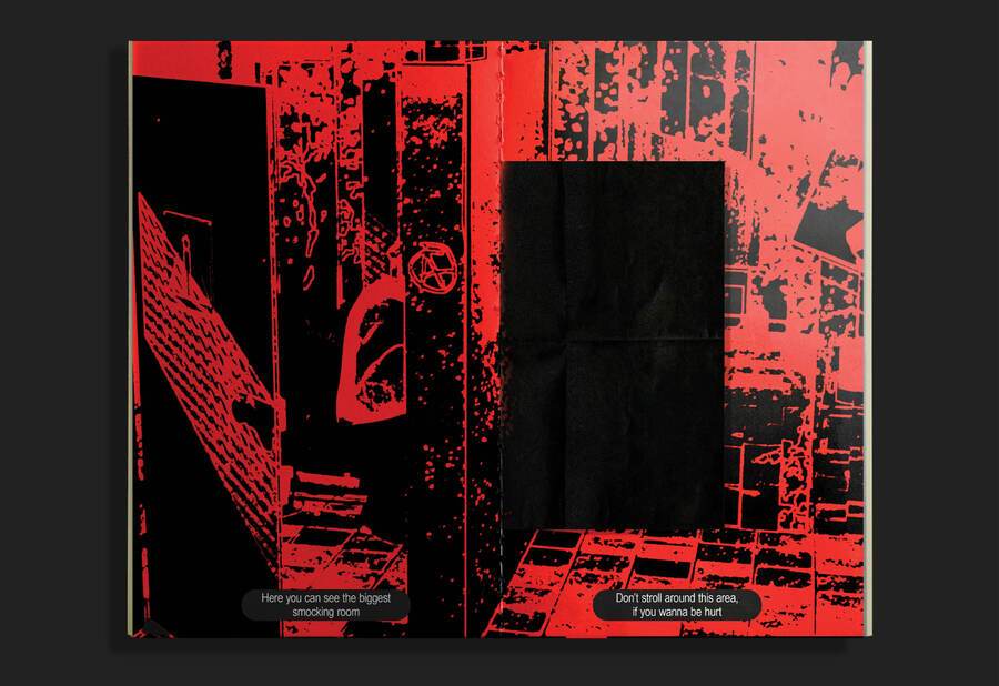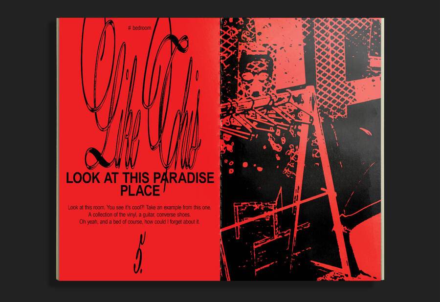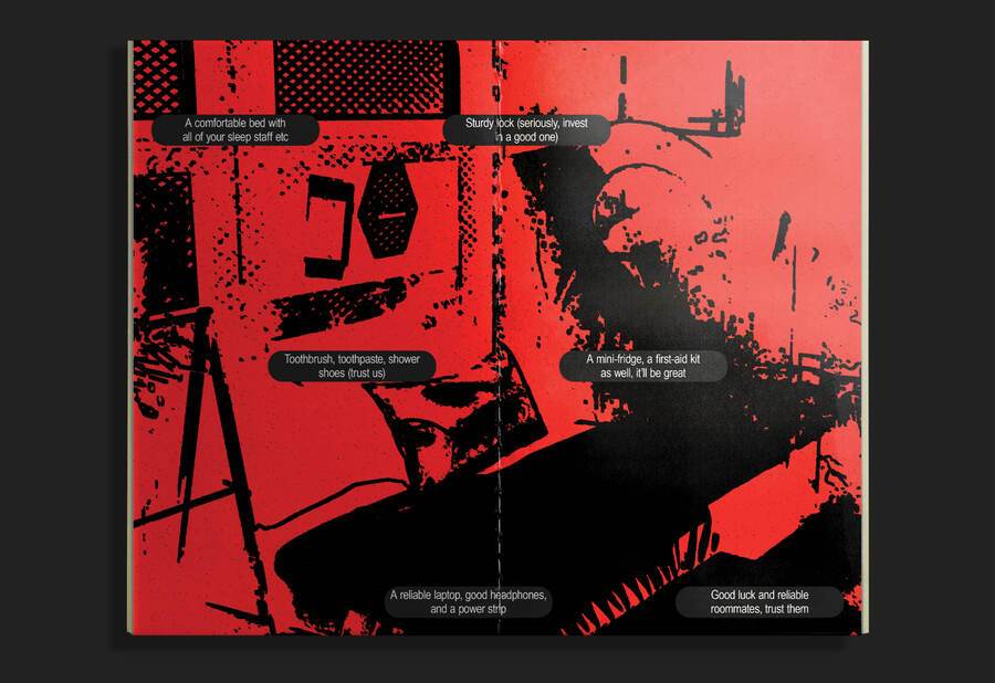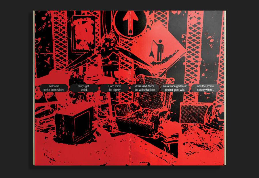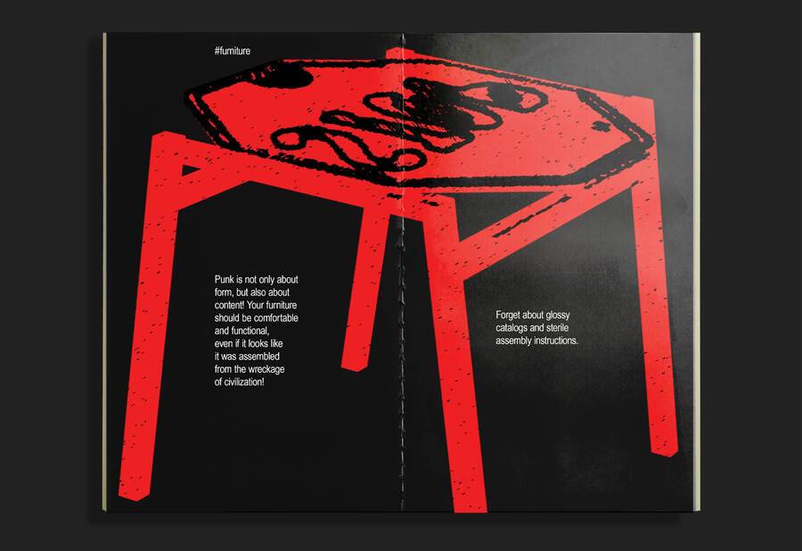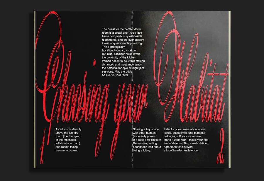 Зин представляет собой инструкцию по выживанию в общаге для панков. Её жильцы обладают бунтарским духом, поэтому принцип типографики — нарушение правил.