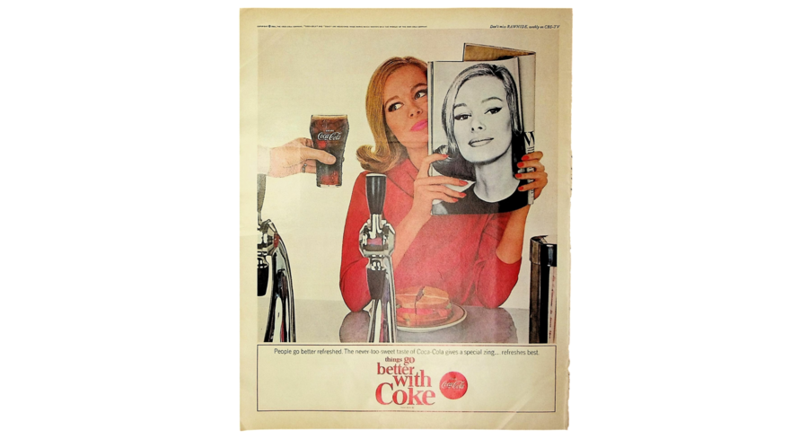 Кампания Coca‑Cola с лозунгом «Things Go Better With Coke», запущенная в начале 1960‑х годов, демонстрирует стратегию визуальной коммуникации, ориентированную на стимулирование массового потребления и формирование эмоциональной привязанности к продукту. В отличие от современных подходов к экологически ориентированной упаковке, где основной акцент делается на снижении воздействия на окружающую среду и воспитании осознанного отношения к потреблению, реклама Coca‑Cola подчёркивала улучшение повседневной жизни через сам продукт. Центральными элементами композиции были узнаваемая бутылка с фирменным контуром, бытовые или социальные сцены, яркая и насыщенная цветовая гамма, а также лаконичный слоган, создающий ощущение радости, комфорта и современного образа жизни. Для анализа визуальных сообщений упаковки эта кампания служит иллюстрацией исходного подхода маркетинга: акцент смещался на удовольствие от потребления.