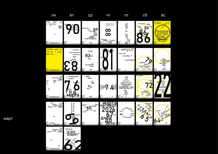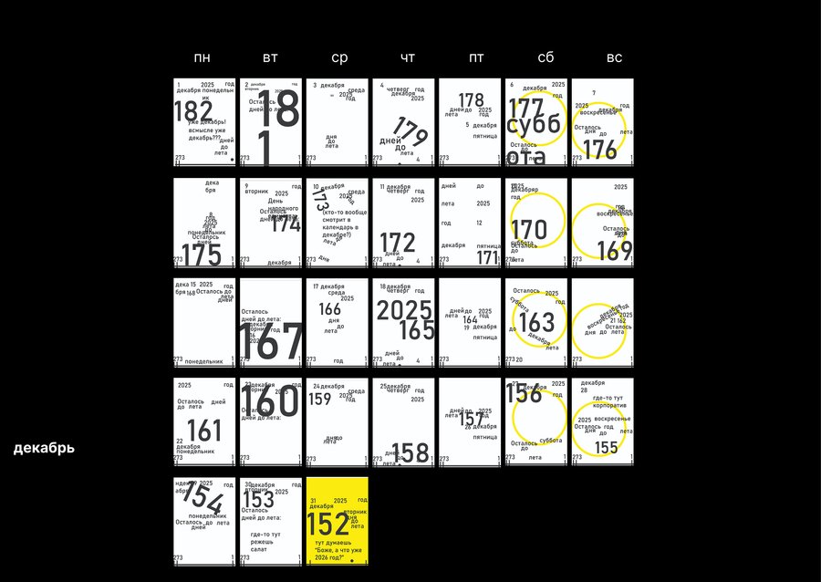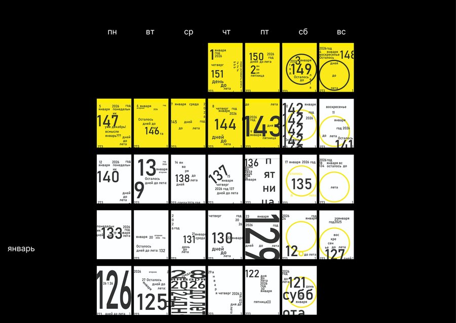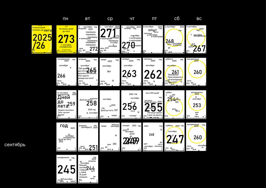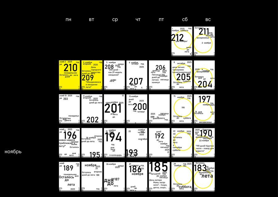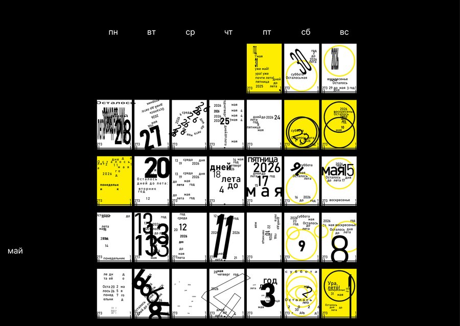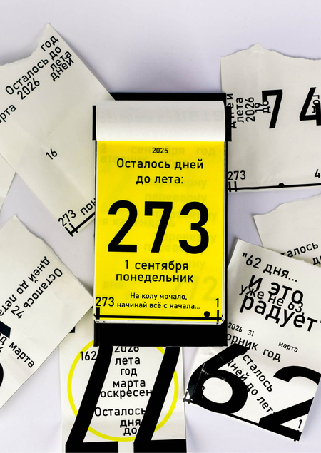 Сколько дней осталось до лета — это отрывной календарь, численник с 273 днями, обратный отсчет до лета. Своего рода высказывание, каждый день меняется типографика, чем ближе к зиме и лету, тем агрессивней и хаотичней она становиться, а нас уже не остановить.