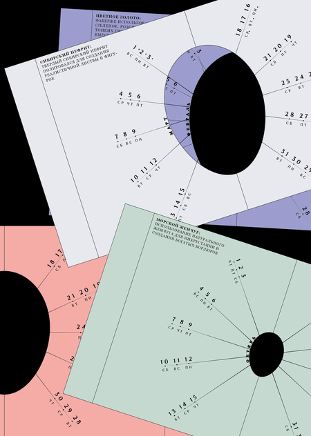 Метафора раскрытия створок. Календарь трансформируется: чтобы увидеть следующий месяц, надо открыть две створки. В них предусмотрена вырубка в форме яйца, которая визуально скрывает даты, акцентируя внимание на названии месяца. Цветовое решение каждого блока отсылает к уникальным императорским яйцам Фаберже. Месяцы сопровождаются информацией об особенностях ремесла