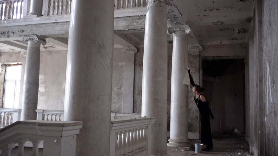 Перформанс строится на мытье колонны в заброшенной усадьбе, выстраивается ситуация встречи автономного знака памяти и телесного жеста заботы без перспективы завершения.