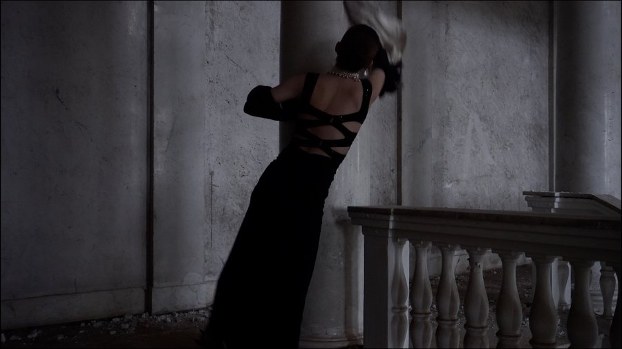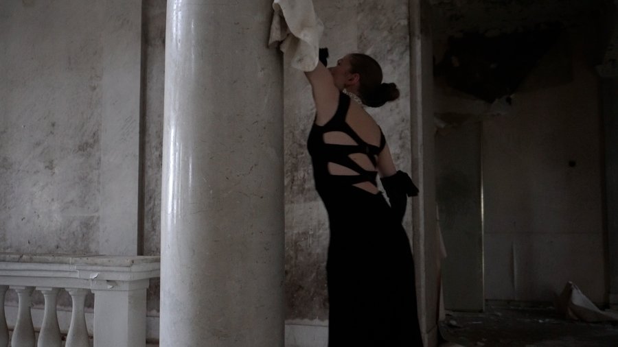 Вечернее платье вводит тело в режим публичной репрезентации, эстетика торжественности совпадает с изнуряющей повторяемостью бытового действия. Мытье ограничено длиной вытянутой руки, что переводит очищение в демонстрации человеческой конечности. Колонна не очищается окончательно и включается в режим присутствия только через прикосновение и повтор, потому само действие — проживание невозможности окончательного очищения.