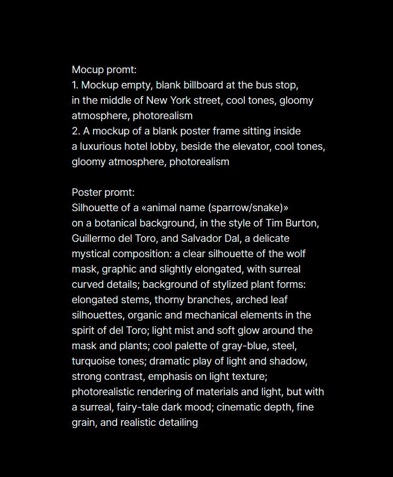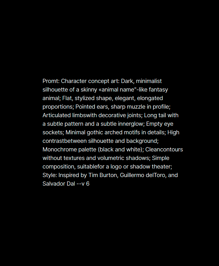 Для достижения нужного стилистического решения в промте были упомянуты художественные работы режиссёров Гильермо дель Торо и Тима Бертона, а также художника Сальвадора Дали. А для сохранения единого визуального языка всех персонажей использовались одинаковые промты с заменой названия животного.