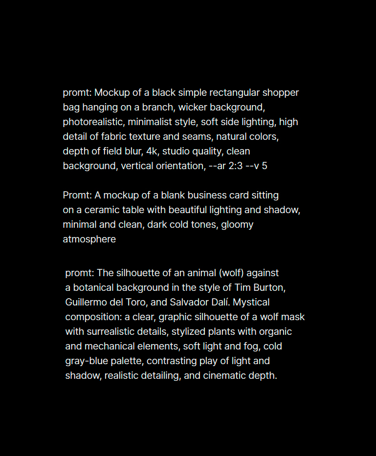 Все использованные промты указаны в карточках слайдеров соотвествующих изображений.