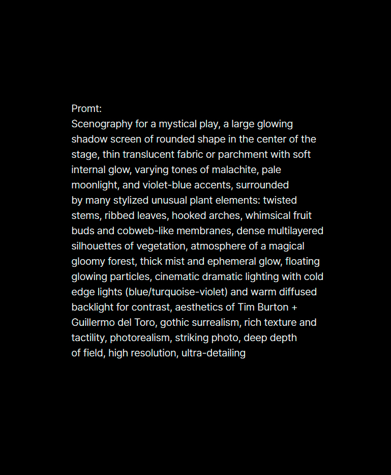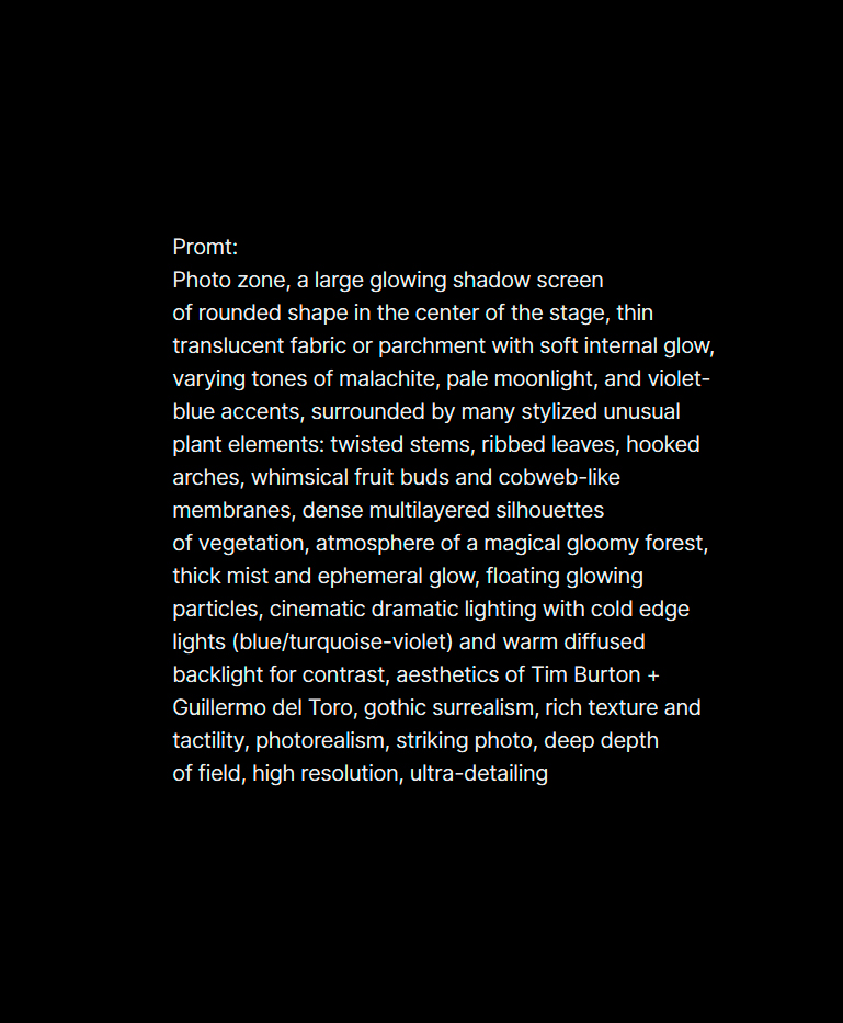 Для редизайна проекта с помощью нейросетей я видоизменяла визуальный стиль художественного оформления, сделав его более изящным и утонченным, вдохновляясь работами режиссёров Гильермо дель Торо и Тима Бертона, а также художника Сальвадора Дали, при этом сохранив основное эстетическое направление: мистическую атмосферу волшебного сада.