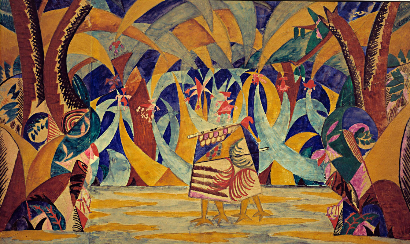 В декорациях Ларионов часто использует народные мотивы: яркие плоскости, крупные контуры, орнаменты, напоминающие росписи и вывески. Из-за этого пространство сцены выглядит как оживший лубок — всё немного условное, нарочито простое, с акцентом на ритм и цвет. Национальный мотив проявляется именно в этой «народности» формы, в смелой обобщённости и в отсутствии реалистичной перспективы. При этом влияние парижской среды видно в самом подходе к сцене: динамичные композиции, необычные ракурсы, усложнённая работа с движением. Это уже не просто лубок, а его модернистское переосмысление.