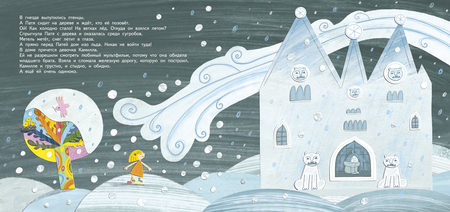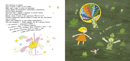 Иллюстрации выполнены в технике «аппликация»: в диджитал, но с использованием настоящих фактур (бумага, покрашенная гуашью). Мне хотелось, чтобы иллюстрации выглядели максимально рукотворно, чтобы чувствовалось тепло от этой техники, как будто всё сделано руками. Детали нарисованы цветными карандашами тоже в диджитал.