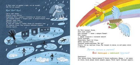 Композиция каждого разворота передаёт и подчеркивает ту или иную эмоцию. Текст активно взаимодействует с иллюстрациями и передаёт разные эмоции. Где-то строки наклонены, где-то — идут по дуге, где-то выделены отдельные фразы или возгласы. На одном развороте чаще всего встречаются одни и те же персонажи в разном эмоциональном состоянии, а так видно, как сменяются эмоции.