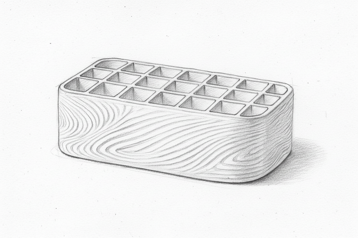 а) Общие рекомендации: - Внутренний размер ячейки (cell_inner) — 24 мм - Толщина внутренних перегородок (wall_thickness) — 2.5 mm. - Толщина внешней стенки (outer_wall) — 3 mm - Глубина ячейки (cell_depth, высота «кармана») — 75 mm - Толщина дна (base_thickness) — 2.5 mm. - Верхний обод/высота над ячейками (top_rim) — 2 mm